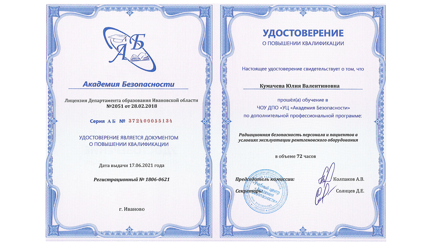 "Радиационная безопасность персонала и пациентов в условиях эксплуатации рентгеновского оборудования", 72 час.