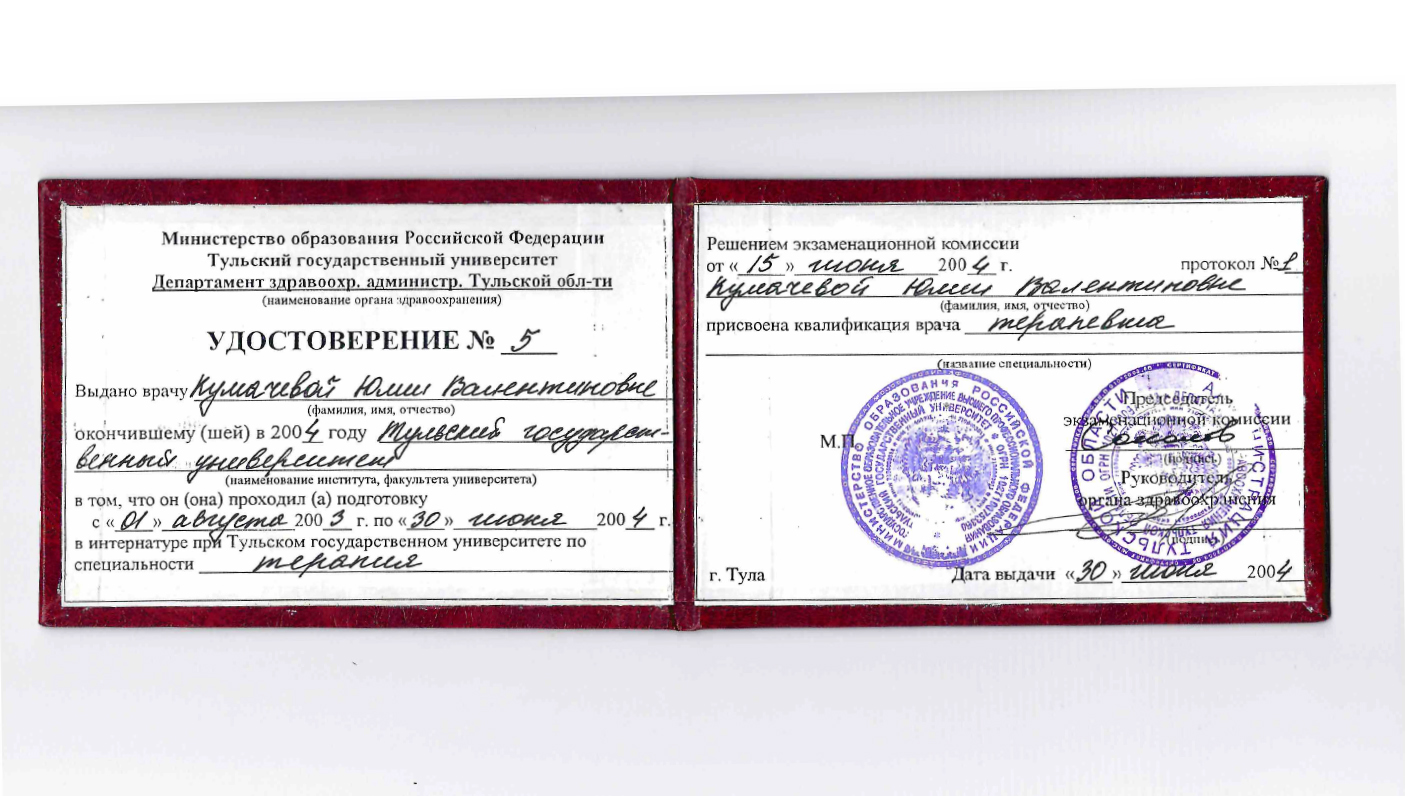 2003 г. - врач-интерн на кафедре ВБ ТулГУ
