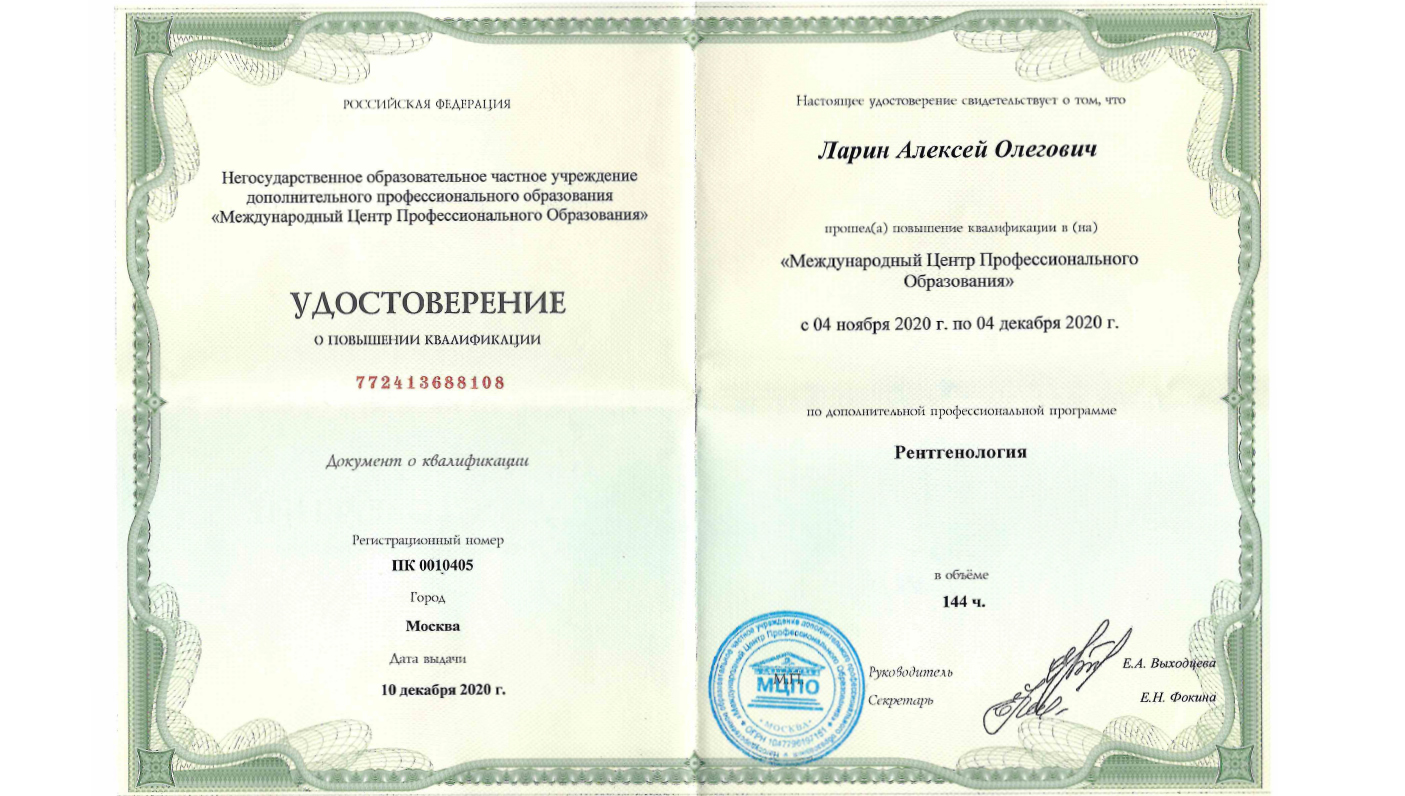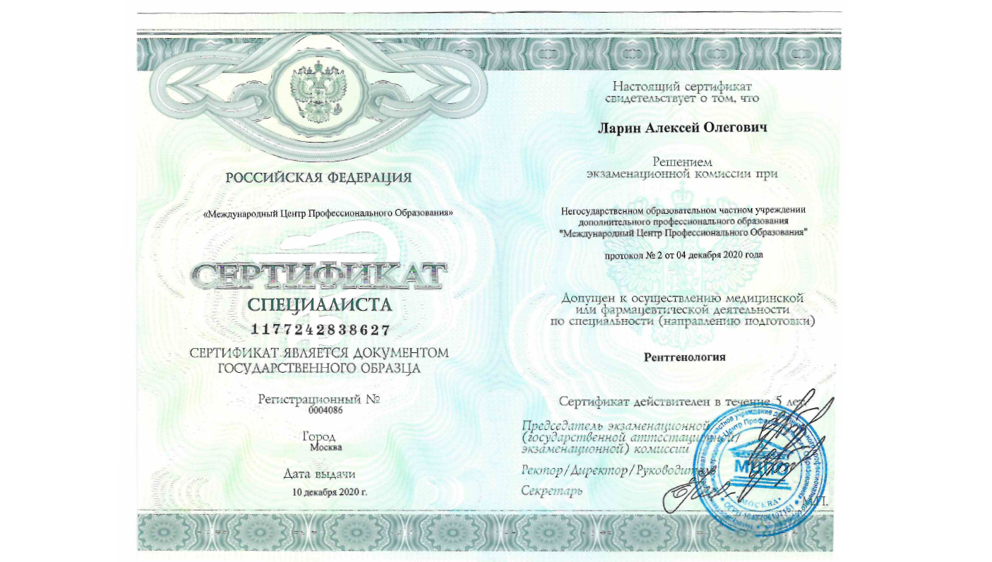 Аккредитован по специальности: рентгенология до 22.09.2030 г. Аккредитован по специальности: организация здравоохранения и общественное здоровье до 25.03.2030 г.