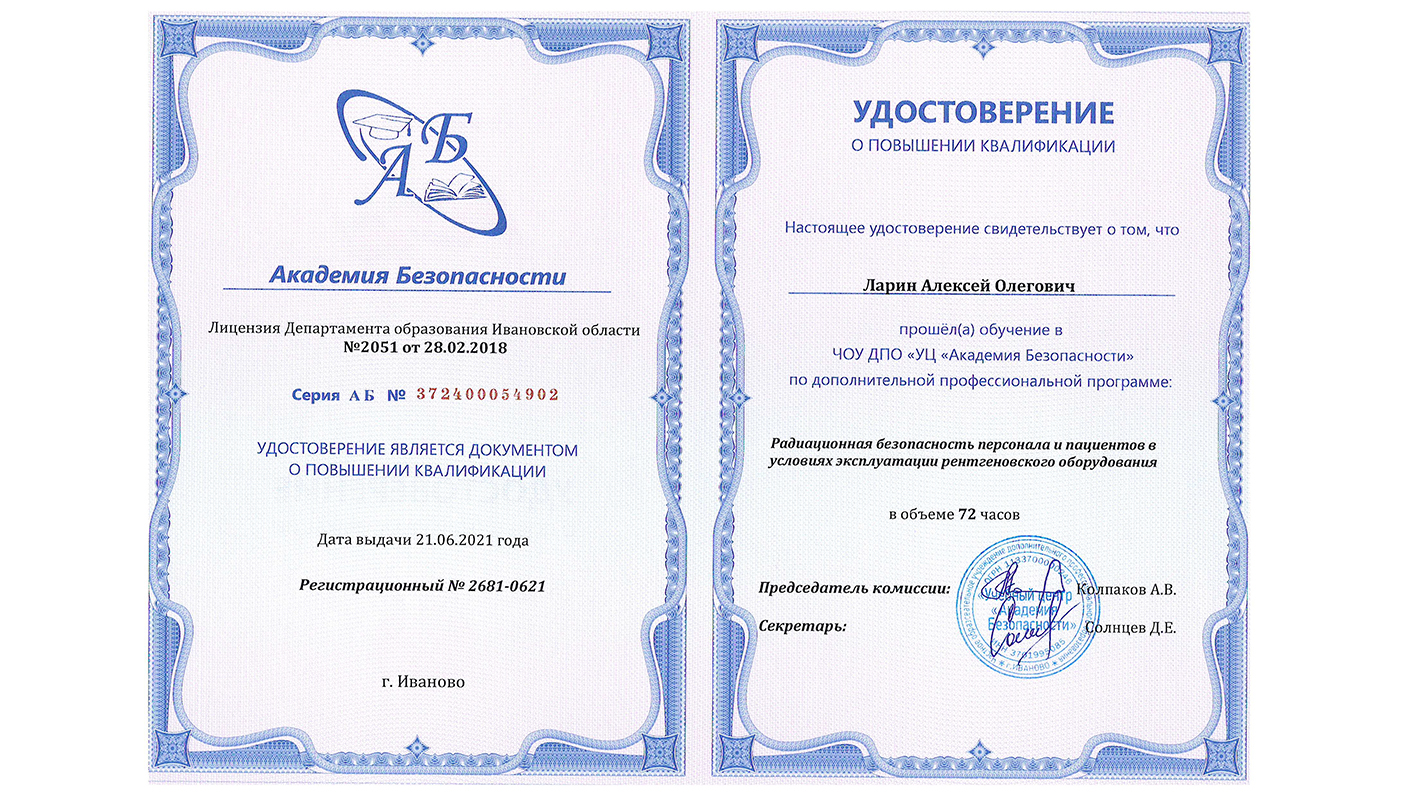 "Радиационная безопасность персонала и пациентов в условиях эксплуатации рентгеновского оборудования", 72 час. 2020 г.