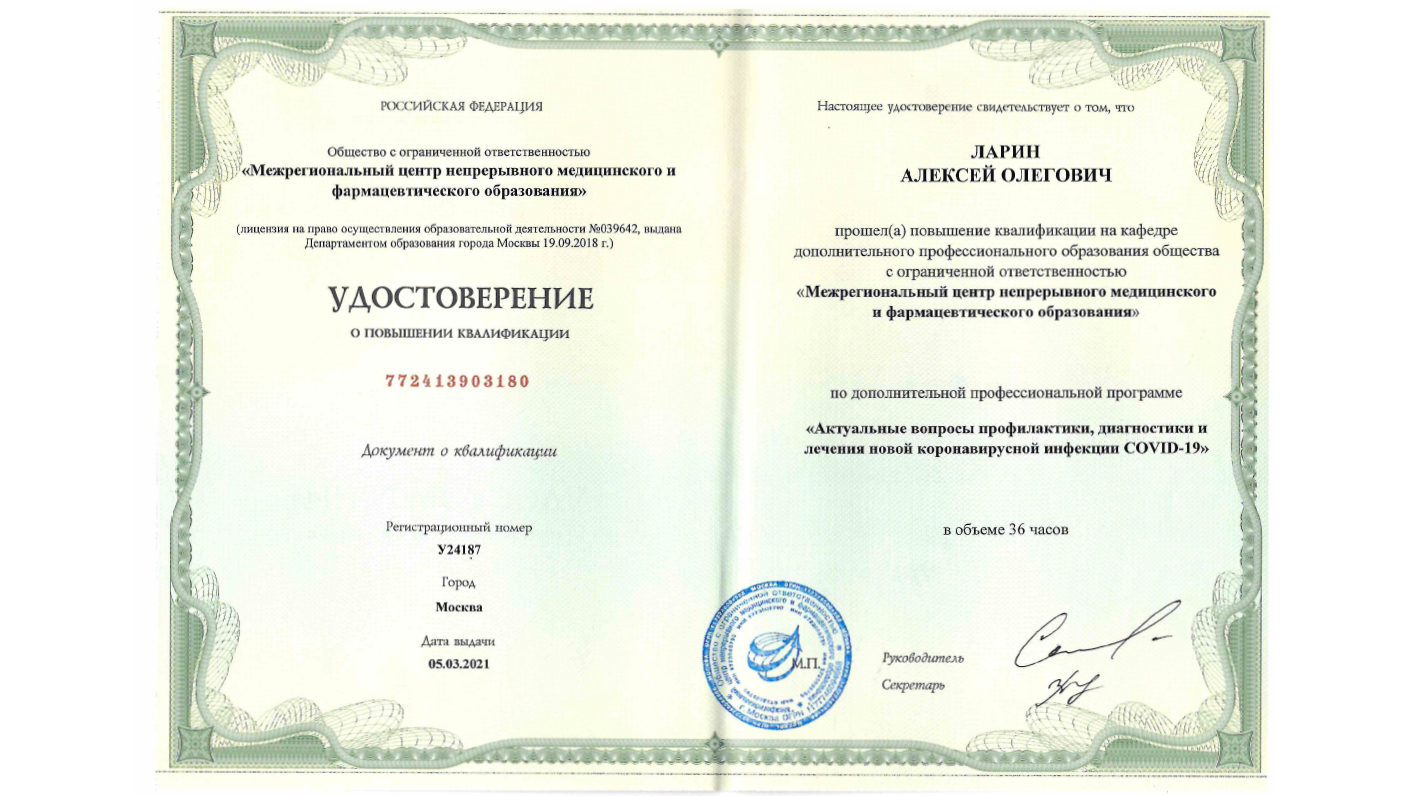 "Актуальные вопросы профилактики, диагностики и лечения новой коронавирусной инфекции COVID-19", 36 час. 2021 г.
