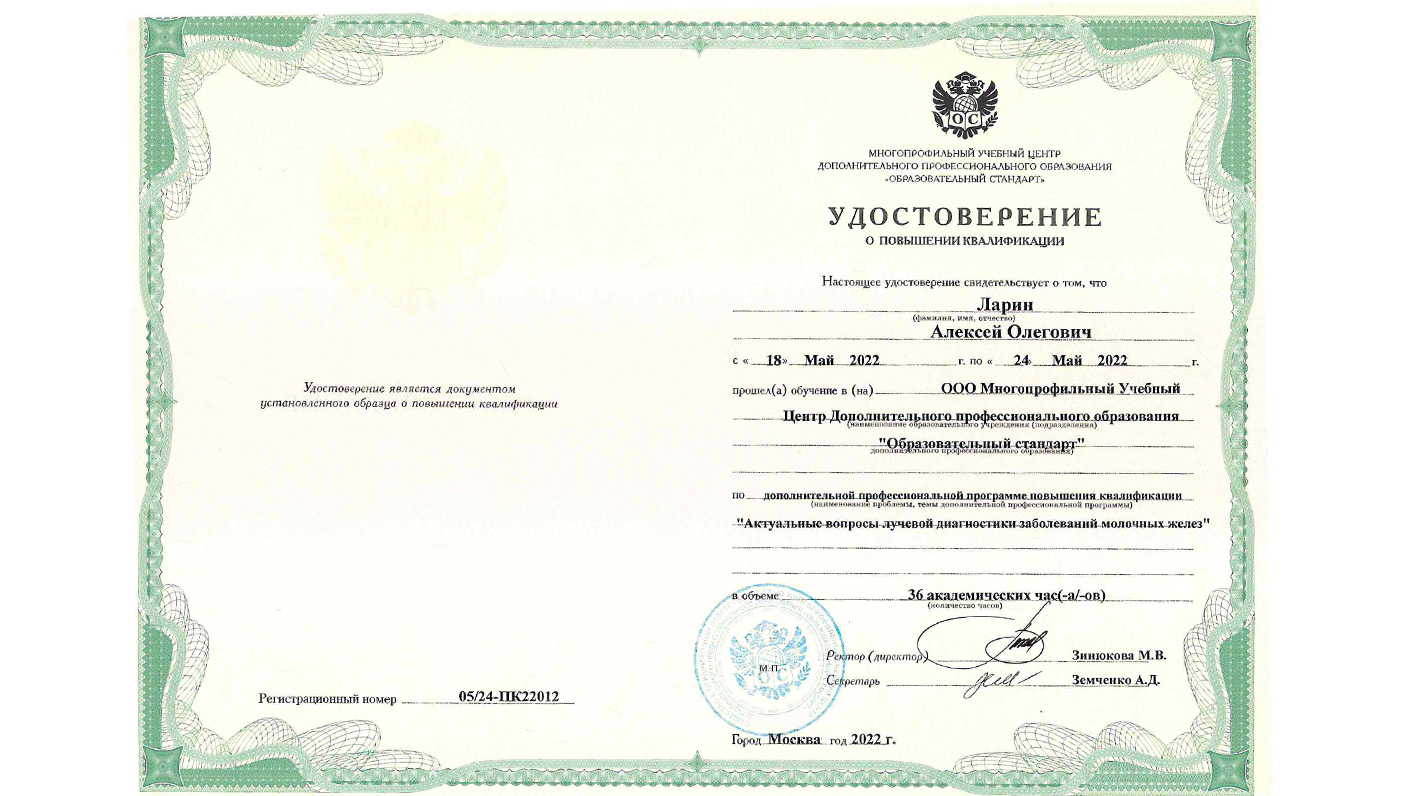 Заместитель главного врача (по взаимодействию клинических и диагностических служб), аккредитованный врач-рентгенолог, заведующий маммологическим центром, аккредитованный врач ультразвуковой диагностики, специалист в области организации здравоохранения и общественного здоровья