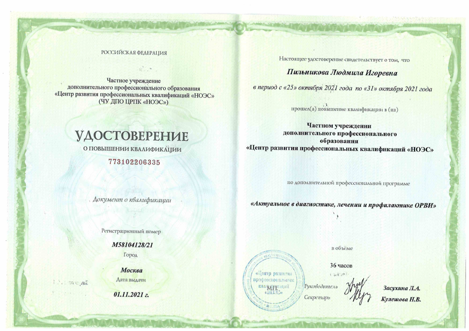 ЧУ ДПО " Центр развития профессиональных квалификаций "НОЭС" "Актуальное в диагностике, лечении и профилактике ОРВИ", 36 час.