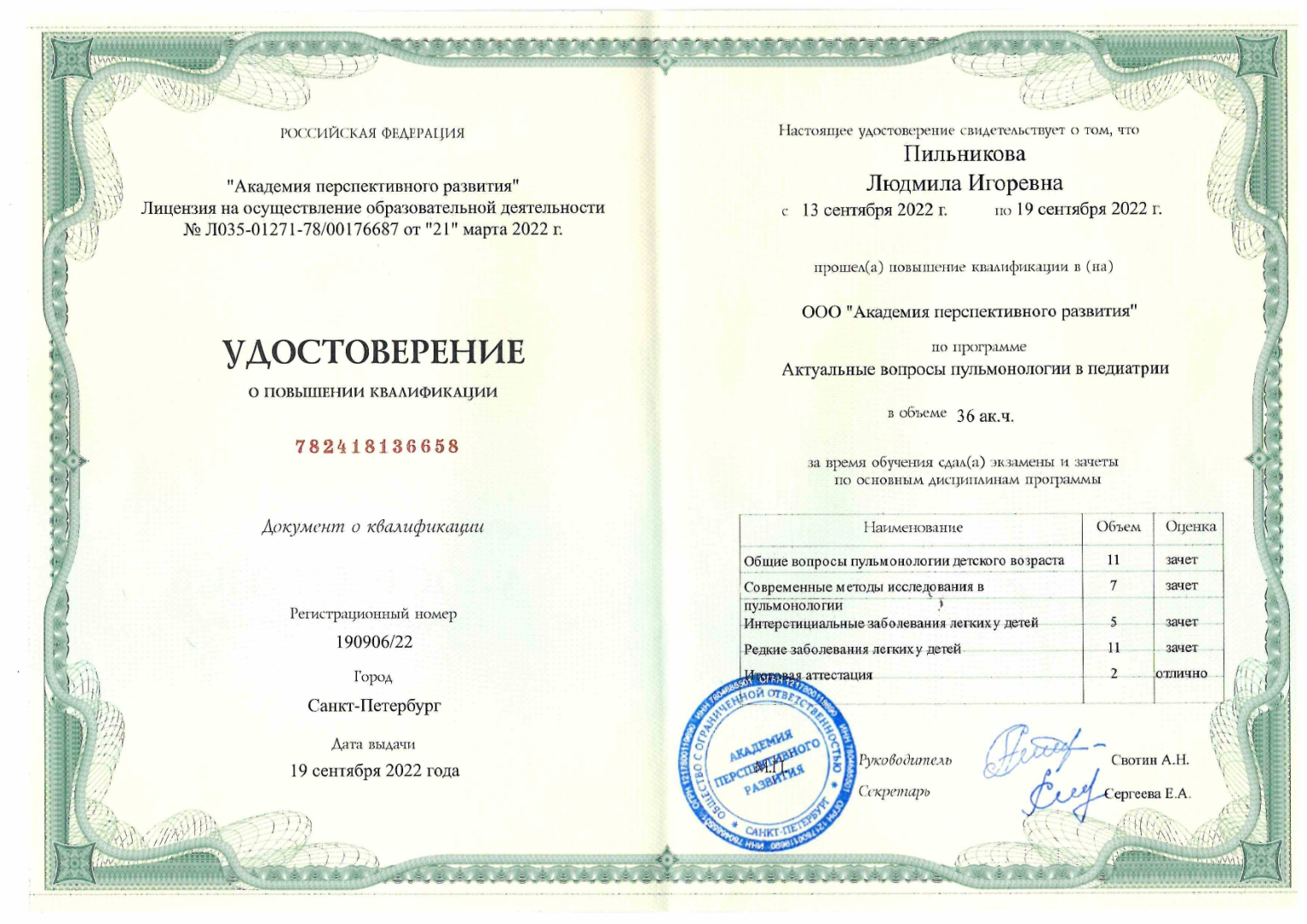 ООО "Академия перспективного развития" "Актуальные вопросы пульмонологии в педиатрии", 36 час.