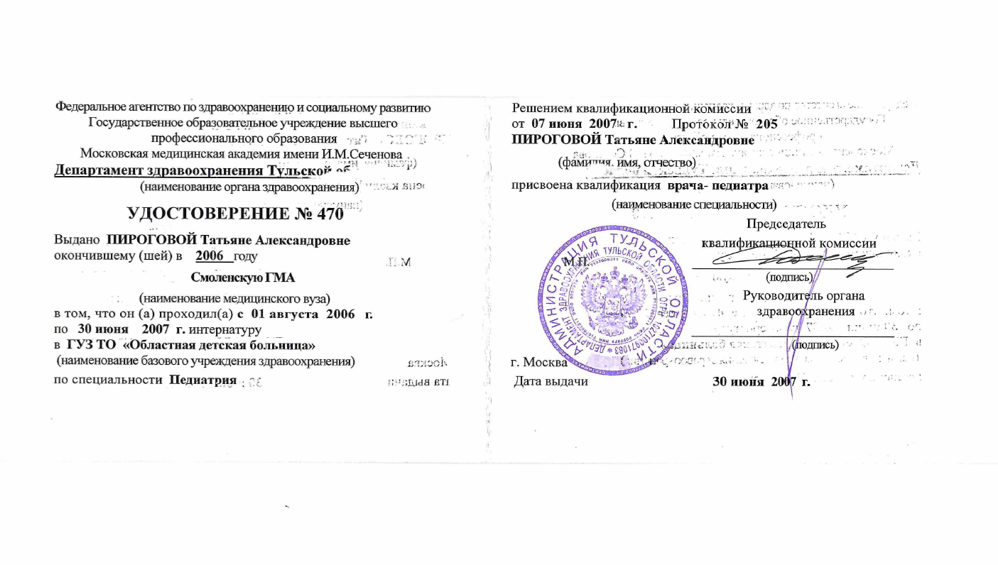 2007 г. - врач-педиатр ГУЗ "Тульская детская областная клиническая больница"
