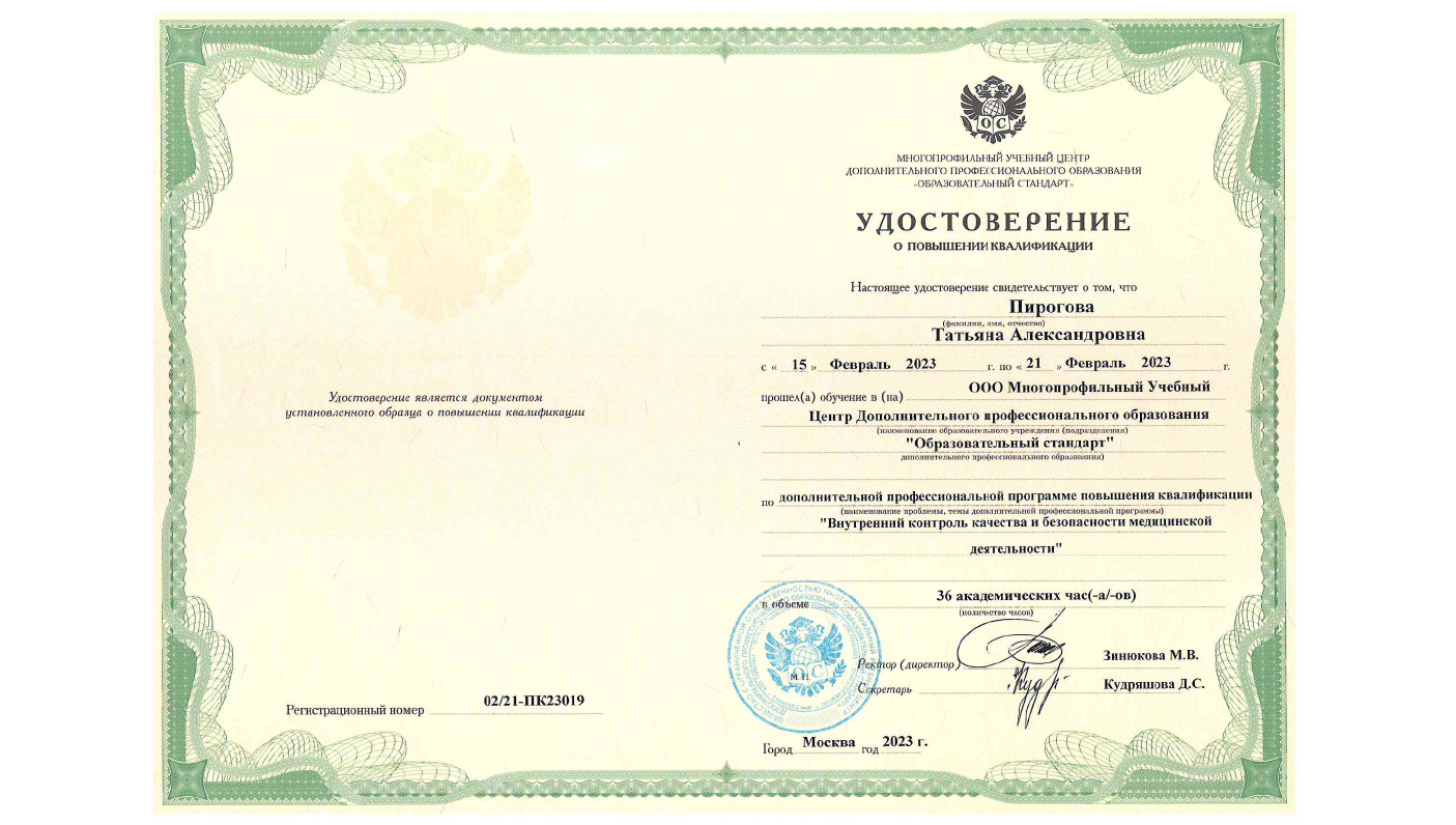 "Внутренний контроль качества и безопасности медицинской деятельности", 36 час.