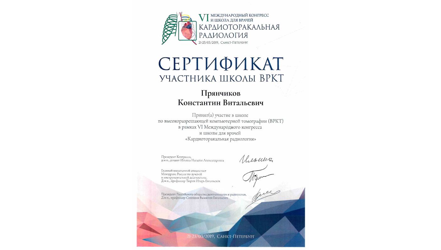 Принял участие в школе по высокоразрешающей компьютерной томографии (ВРКТ) в рамках VI Международного конгресса и школы для врачей "Кардиоторакальная радиология"
