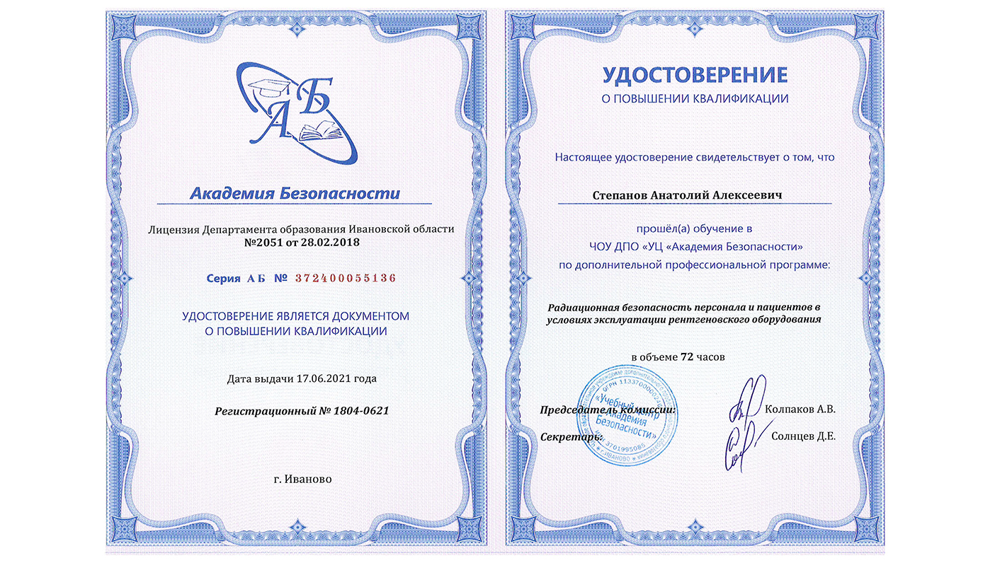 "Радиационная безопасность персонала и пациентов в условиях эксплуатации рентгеновского оборудования", 72 час.
